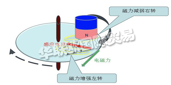 旋轉(zhuǎn)磁場(chǎng)和固定的銅板發(fā)生兩個(gè)渦電流,兩個(gè)渦電流合成發(fā)生感應(yīng)電流。感應(yīng)電流在磁場(chǎng)中發(fā)生電磁力,發(fā)生電機(jī)扭矩。