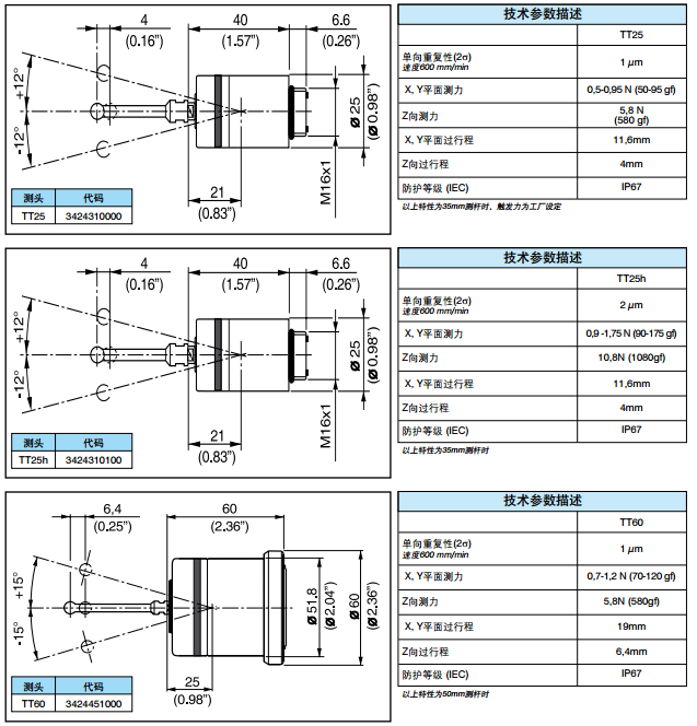 MARPOSS側(cè)頭TT系列測(cè)頭分為TT25、TT25h、TT60三類,TT25h測(cè)頭是大觸發(fā)力的TT25產(chǎn)品,允許使用